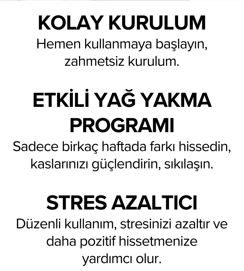 Ürün gerçekten çok kaliteli. Kurulumu kolay, yer kaplamıyor ve kas gruplarını çalıştırmada oldukça etkili. Evde spor yapmayı keyifli hale getirdi!